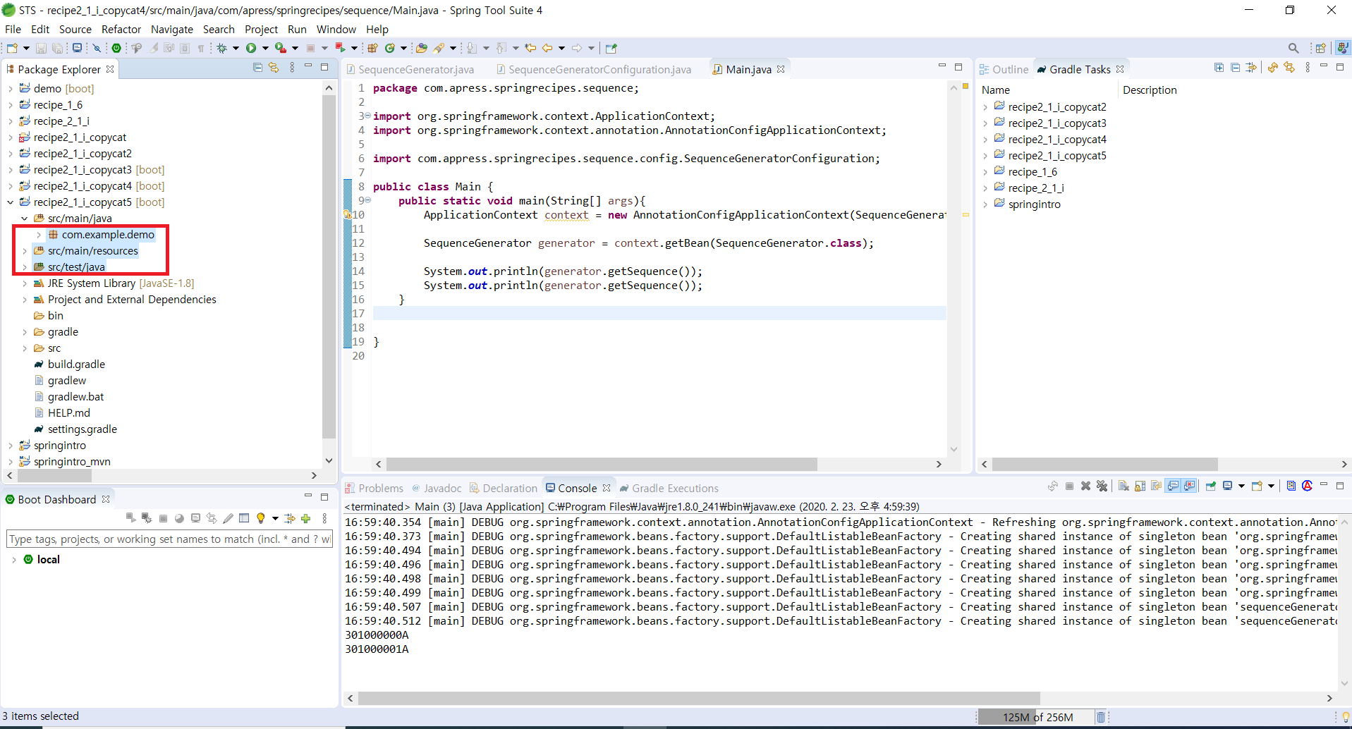 1 2 3 4 5 6 7 8 9 10 11 12 13 14 15 16 | package com.apress.springrecipes.sequence; import org.springframework.context.ApplicationContext; import org.springframework.context.annotation.AnnotationConfigApplicationContext; public class Main { public static void main(String[] args) { ApplicationContext context = new AnnotationConfigApplicationContext("com.apress.springrecipes.sequence"); SequenceService sequenceService = context.getBean(SequenceService.class); System.out.println(sequenceService.generate("IT")); System.out.println(sequenceService.generate("IT")); } } | cs |